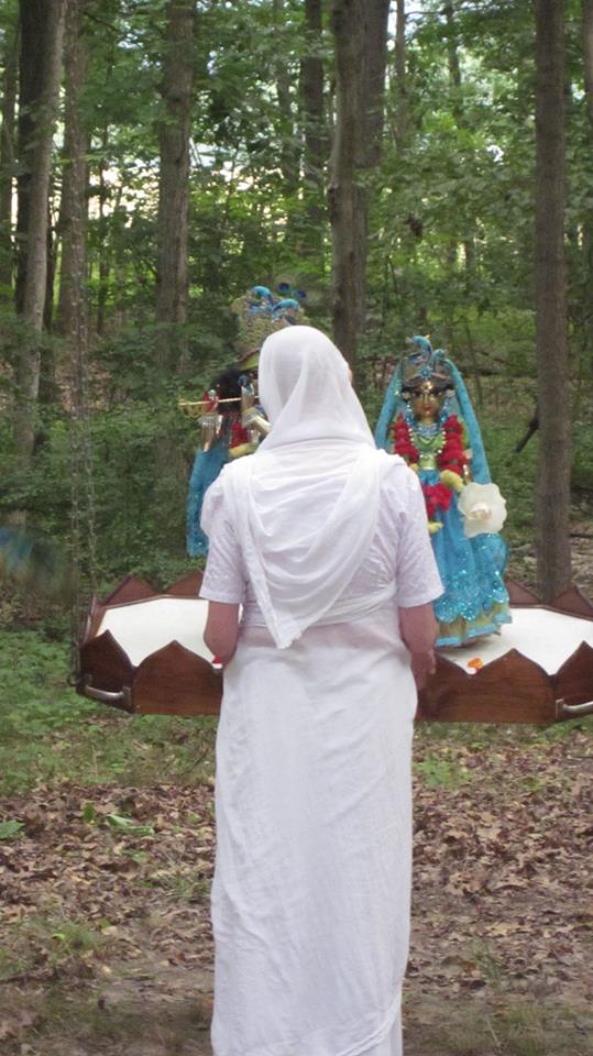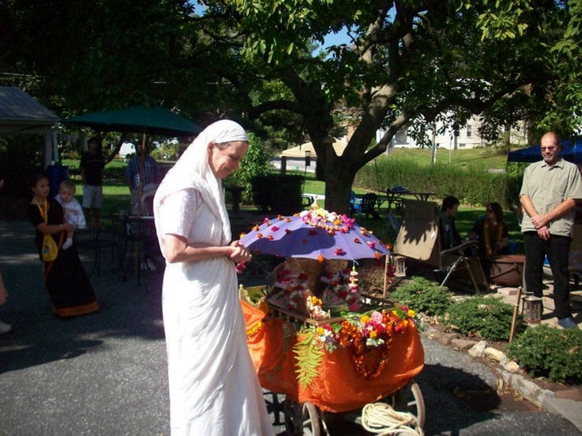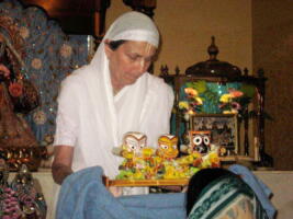 Тамал Кришна Махараджа и Вишнуджана поклонялись Радхе-Дамодаре. Они объездили всю Америку с Ними и привлекли таким образом сотни преданных. Но позднее Божество оказалось в Гита-нагари, на ферме Шрилы Прабхупады. И Тамал Кришна Махараджа не видел этих Божеств, может быть, в течение 15 лет. Я часто бываю там, путешествуя между Нью-Вриндаваном и Нью-Йорком. У меня близкие отношения с теми, кто там живёт. Тамал Кришна мой друг, и я предложил ему, что, когда он будет в Нью-Йорке, я устрою ему поездку на ферму на даршан к Радхе-Дамодаре, которых он увидит впервые за последние 15 лет. Матушка Каулини готовила для него. Махараджа видел, как она служит, и однажды повернулся ко мне и сказал: «Какая разница в том, что делает матушка Каулини сейчас и будет делать после того, как оставит тело?» Она каждый день ходила в коровник, всегда без обуви, доила коров и поклонялась Радхе-Дамодаре. Это то, что делают гопи. Поэтому между ее сознанием и деятельностью и сознанием и деятельностью гопи не было разницы.